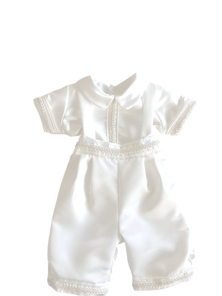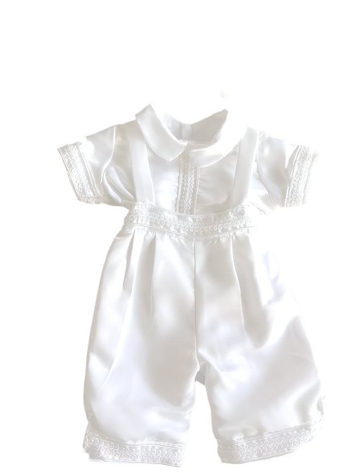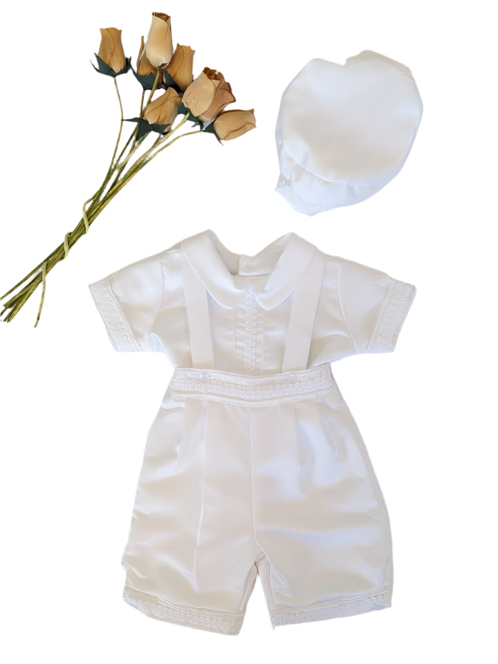 14089 Baby boy 3 piece Christening romper set, satin feel, dungaree style, complete with hat.