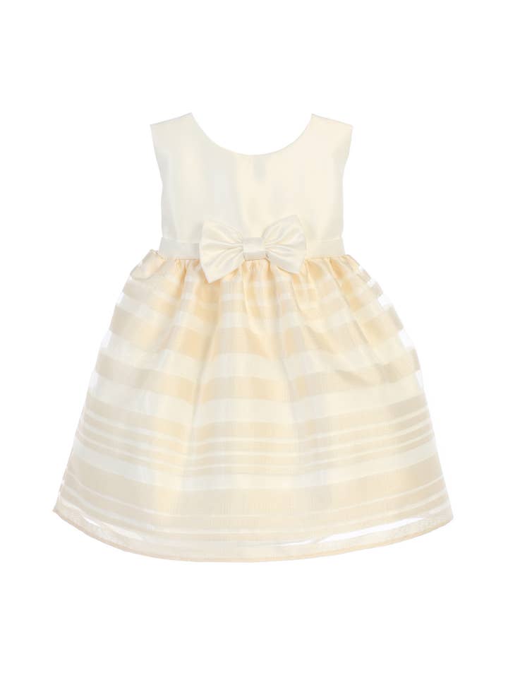 Satin with bold striped organza with satin bow detail at waist. knee length...