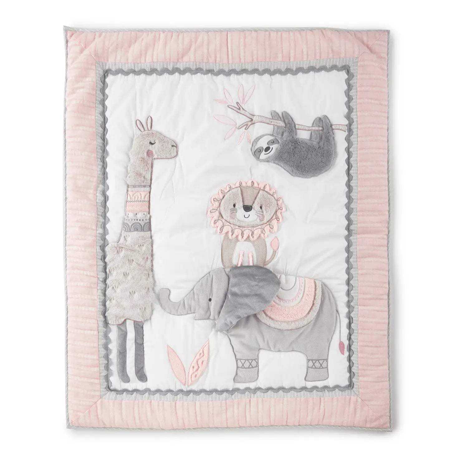 The Imani 4-piece nursery set features 5 beautifully coordinated and complementary pieces, consisting of a quilt, a 100% cotton fitted sheet, a dust ruffle and a large decorative wall decal. FEATURES You night feel like you are surrounded by your favorite animals with the adorable Imani collection. The fitted sheet, which features tossed animals and leaves in pinks and greys, is set off by a tailored dust ruffle in a sophisticated pink fabric trimmed with cotton tassels. The quilt features a lion atop her elephant friend, while a llama and sloth look on. All are appliqued and embroidered in interesting textures and with exquisite detail. The large nursery wall decal allows you to create a mural amazing animals and the words, Dream Big Little One. This is the perfect set to complete your baby nursery. Coordinating items available.